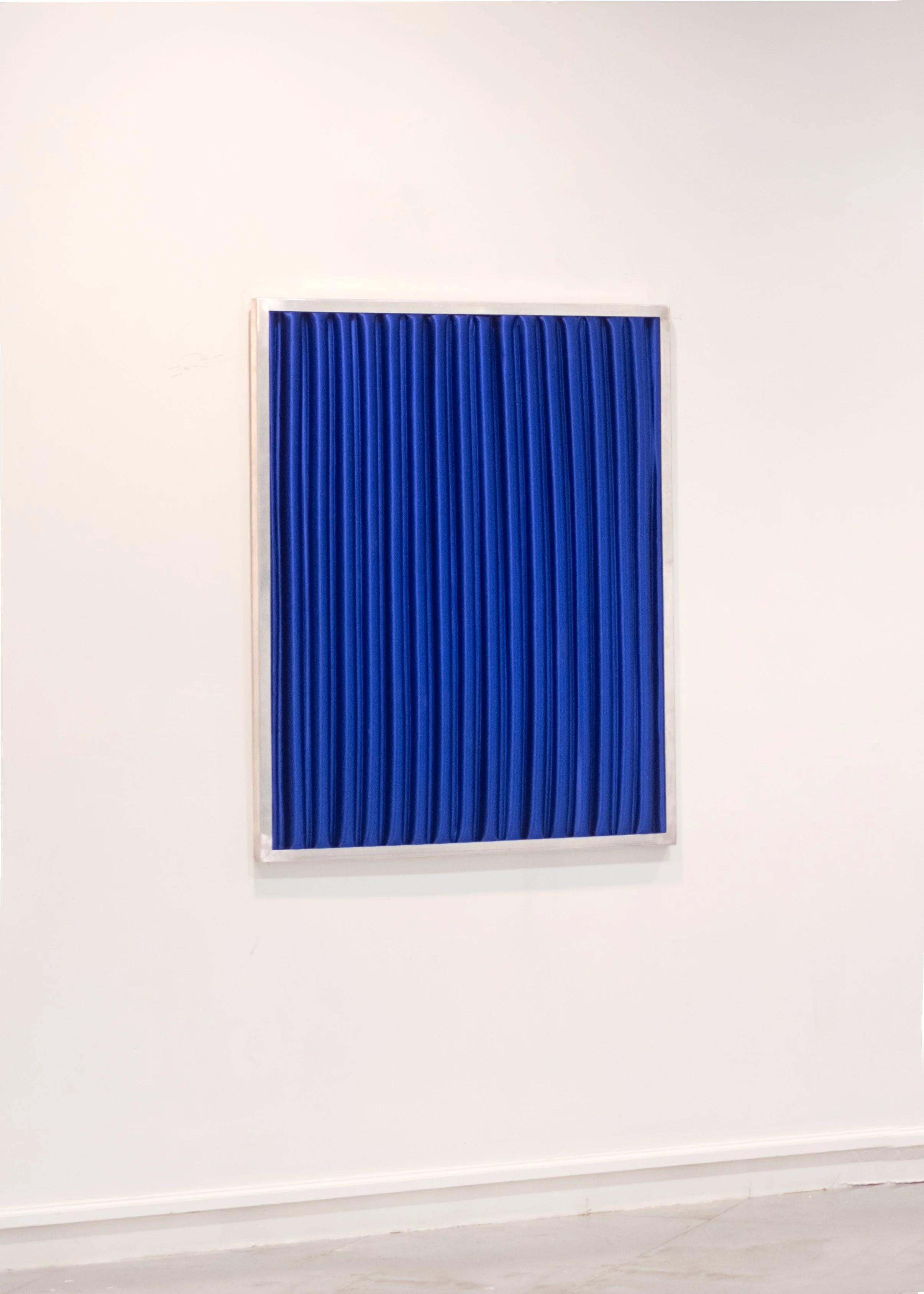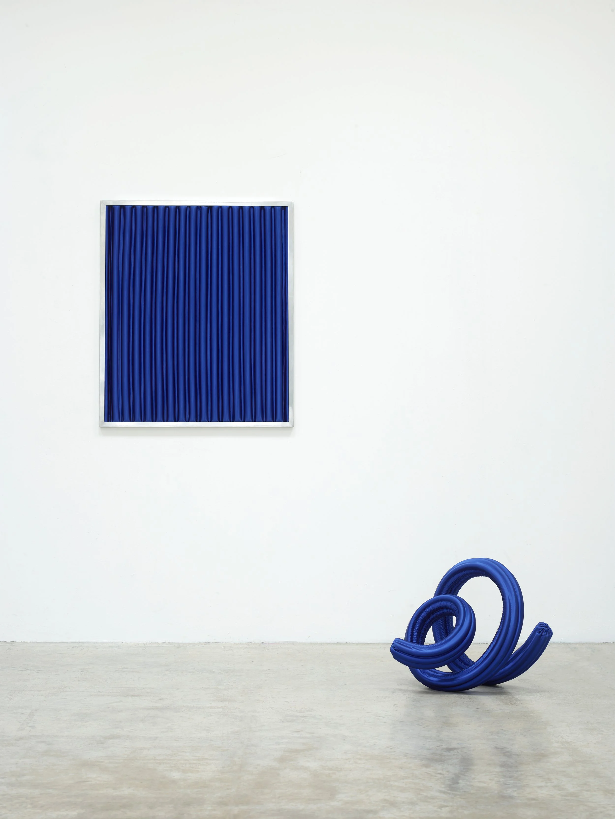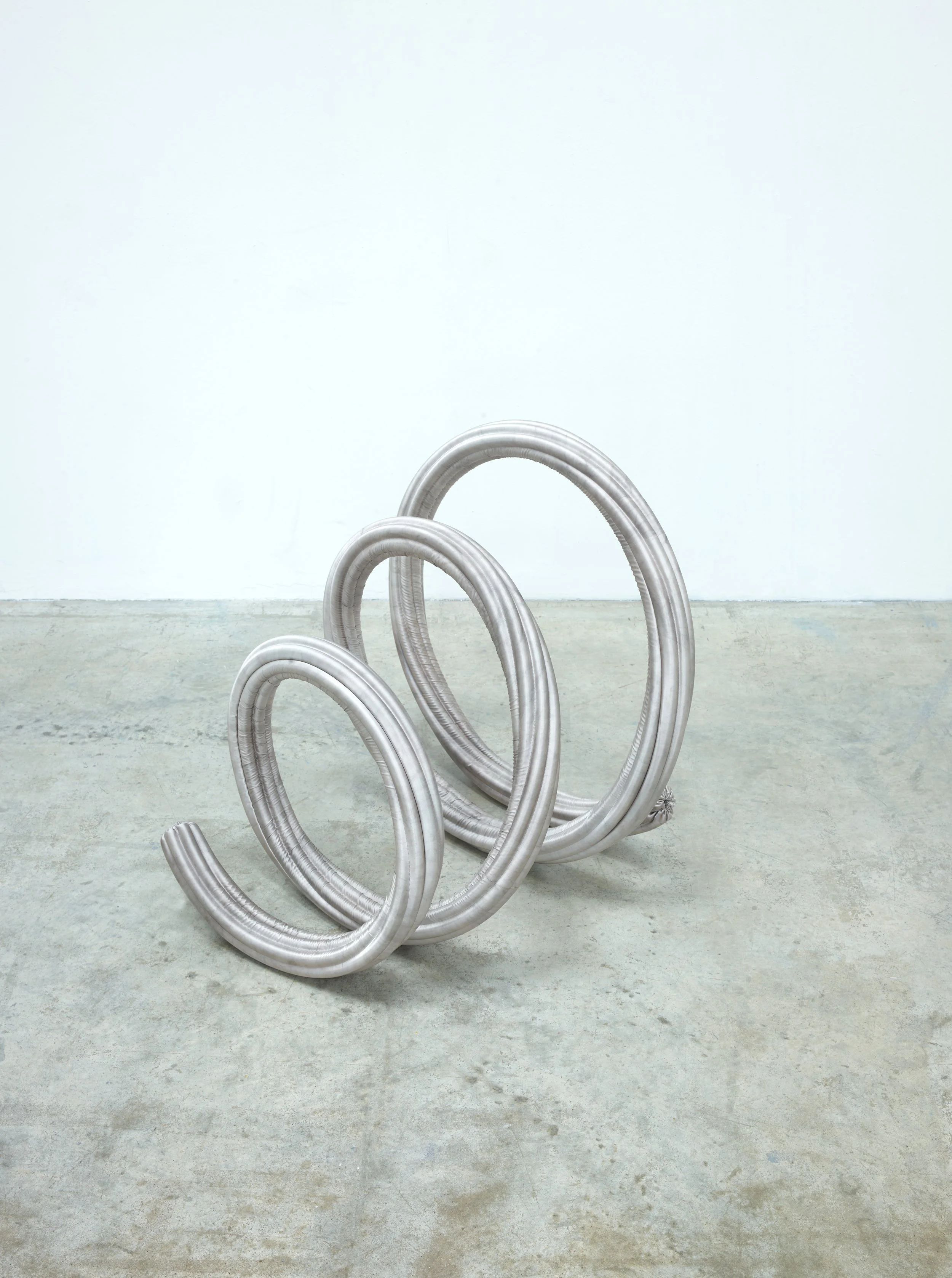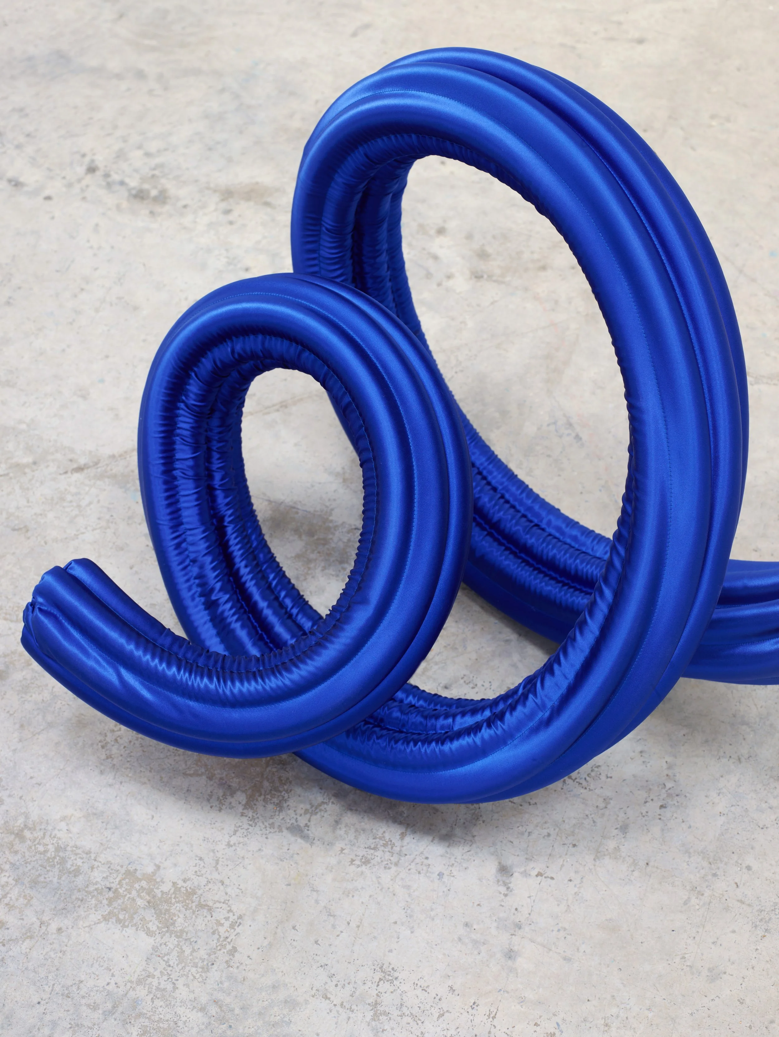 Three sculptural works for group exhibition at the Koppel Project, London. This body of work explores queer, diasporic identity through sculptural forms that act as soft armour -structures that bend, spiral and continually reshape. Their surfaces hold personal geography: silver fabric hand-dyed with stains from the grass and ground where I grew up, and nazar blue that forms a protective, atmospheric threshold. Across these shifting forms, softness becomes a mode of survival, tracing non-linear paths of movement, memory, and becoming.